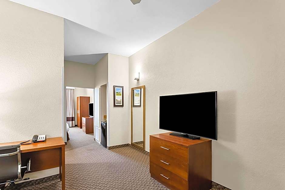 This spacious suite contains 1 king size bed, 55" Smart TV and ceiling fan, in the bedroom, along with sofa sleeper, desk, microwave, mini fridge, ceiling fan and another 55" Smart TV in the seating area. This suite has a walk-in shower unit.